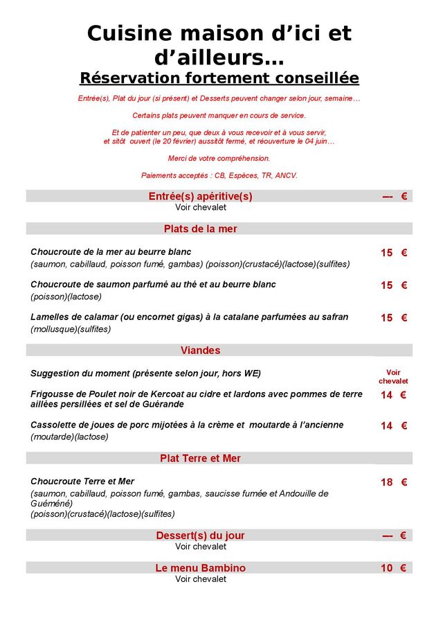 Notre restaurant est équipé pour accueillir les personnes à mobilité réduite. Les animaux de compagnie sont les bienvenus. Il est récommandé de réserver dès maintenant une table. Nous serons ravis de faire votre connaissance. Une réservation est de même possible par tél. en appelant le +33299587942. Nous acceptons les paiements dématérialisés, la MasterCard, les tickets repas, la VISA et les chèques-vacances comme moyen de paiement. Il est en outre possible de payer en espèces. 5 jours par semaine, vous pouvez nous rendre visite de 12.00 à 14.00 et de 19.00 à 20.30. Nos jours de repos sont le mardi et le mercredi.